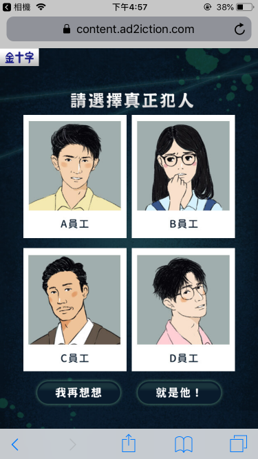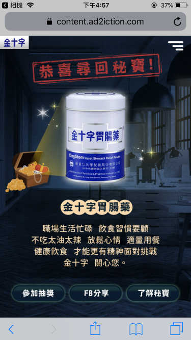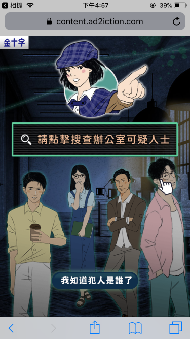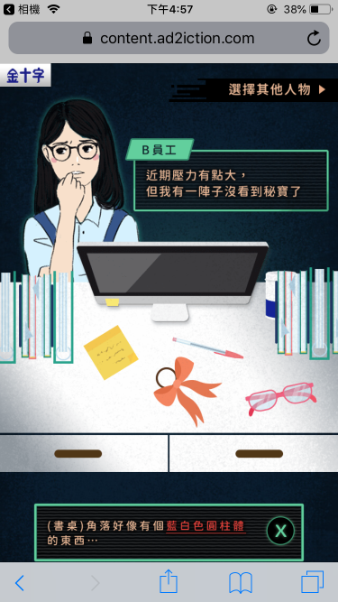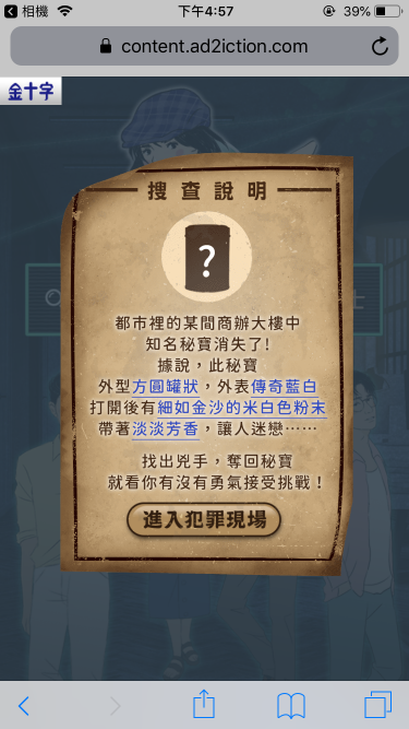 將金十字腸胃藥包裝為上班族的秘寶,與偵探搜查情境遊戲結合, 引導使用者在故事劇情中,找到偷走秘寶的真兇!